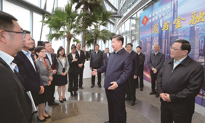 2018年11月6日至7日,中共中央總書(shū)記、國(guó)家主席、中央軍委主席習(xí)近平在上??疾?。這是6日上午,習(xí)近平在上海中心大廈22層的陸家嘴金融城黨建服務(wù)中心,同正在聯(lián)合開(kāi)展主題黨日活動(dòng)的企業(yè)黨員親切交談。 新華社記者 謝環(huán)馳/攝