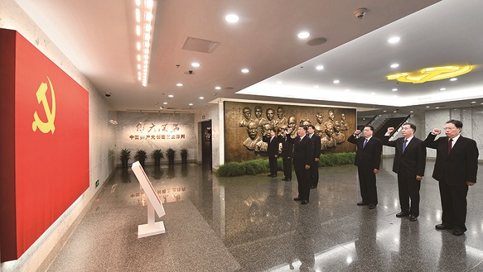 2017年10月31日,中共中央總書(shū)記、國(guó)家主席、中央軍委主席習(xí)近平帶領(lǐng)中共中央政治局常委李克強(qiáng)、栗戰(zhàn)書(shū)、汪洋、王滬寧、趙樂(lè)際、韓正,瞻仰上海中共一大會(huì)址和浙江嘉興南湖紅船。這是31日上午,在上海中共一大會(huì)址紀(jì)念館,習(xí)近平帶領(lǐng)其他中共中央政治局常委同志一起重溫入黨誓詞。 新華社記者 李濤/攝