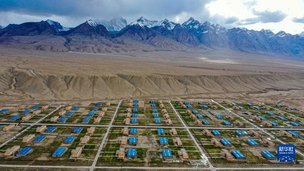 這是在新疆塔什庫爾干塔吉克自治縣縣城附近拍攝的塔提庫力易地扶貧搬遷安置點(2019年7月1日攝,無人機照片)。新華社記者 胡虎虎 攝