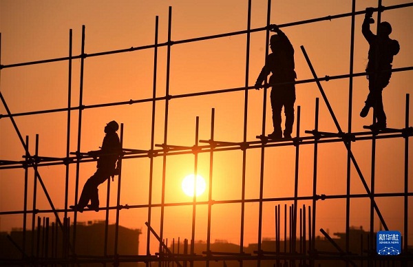 2022年1月1日,在河北雄安新區(qū)容西安置房項目D標段施工現(xiàn)場,中鐵上海工程局工人在新年第一縷陽光的照耀下工作。新華社發(fā)(傅新春 攝)