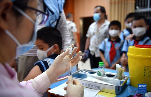 醫(yī)護人員在海口市瓊山第三小學為學生接種疫苗(2021年10月28日攝)。新華社記者 郭程 攝