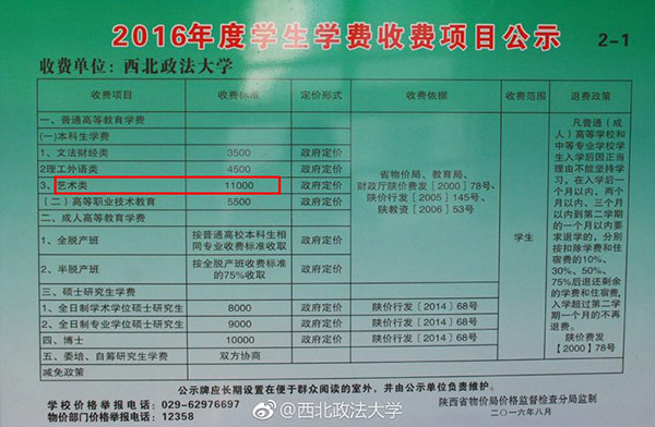 西北政法大學(xué)公布的收費(fèi)標(biāo)準(zhǔn),其中藝術(shù)類統(tǒng)一收費(fèi)11000元。爆料人供圖