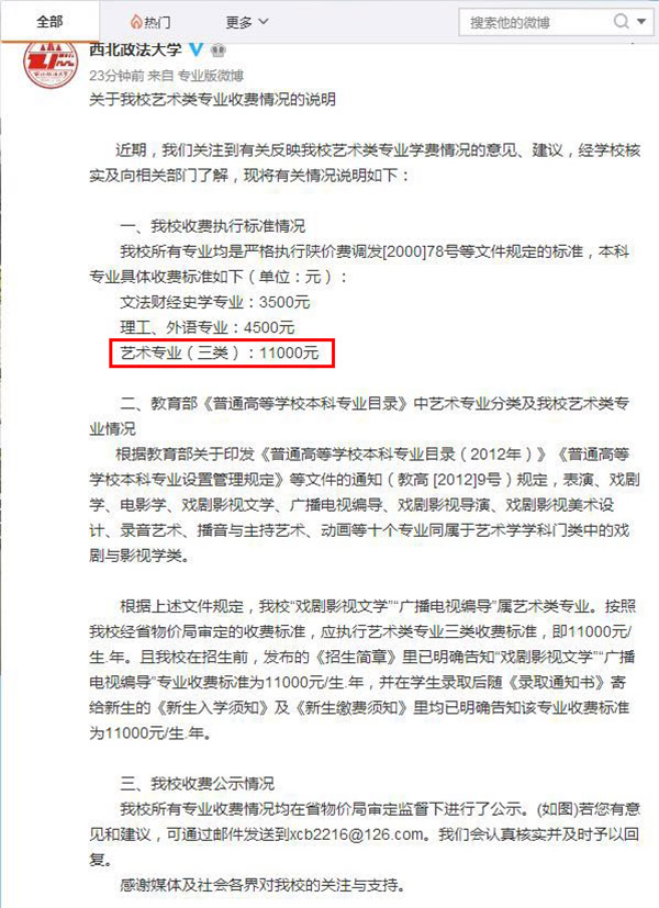 對(duì)于學(xué)生的質(zhì)疑,3月31日,西北政法大學(xué)在官方微博上發(fā)布《關(guān)于我校藝術(shù)類專業(yè)收費(fèi)情況的說明》,稱:我校“戲劇影視文學(xué)”、“廣播電視編導(dǎo)” 屬藝術(shù)類專業(yè),按照我校經(jīng)省物價(jià)局審定的收費(fèi)標(biāo)準(zhǔn),應(yīng)執(zhí)行藝術(shù)類專業(yè)三類收費(fèi)標(biāo)準(zhǔn),即11000元/生.年。