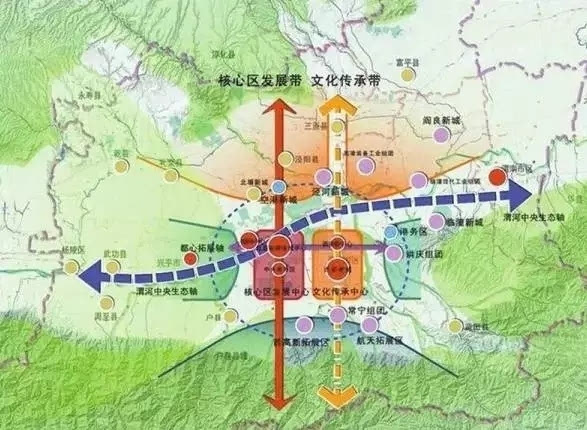此南北軸向西65公里是咸陽寶雞市界,向東65公里是西安渭南界,這個(gè)范圍正好是關(guān)中平原最寬的地方,包括西安、咸陽、西咸新區(qū),同時(shí)納入楊凌、富平形成23個(gè)城市組團(tuán)。
