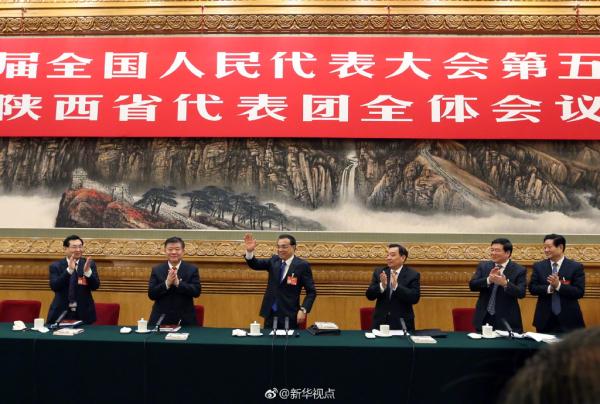 李克強(qiáng)總理今天上午來(lái)到十二屆全國(guó)人大五次會(huì)議陜西代表團(tuán),與代表共同審議報(bào)告。