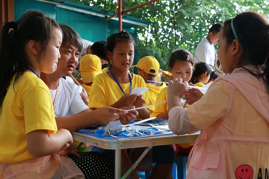 孩子們?cè)诹x工的指導(dǎo)下制作飛機(jī)模型