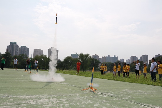 孩子們制作的火箭模型發(fā)射