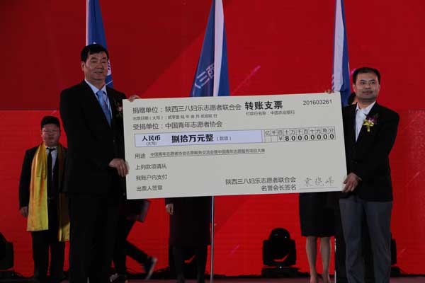 在成立儀式上,聯(lián)合會向團中央捐贈80萬元扶持資金用于“中國青年志愿者協(xié)會志愿服務(wù)交流會暨中國青年志愿服務(wù)項目大賽”,同時,向陜西省青少年發(fā)展基金會捐贈20萬元用于扶持“陜西省青少年公益項目大賽”項目。