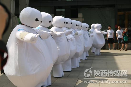 5月19日上午,一群“大白”空降民樂園萬達(dá)廣場,憨態(tài)可掬地做起廣播體操,萌萌噠的姿態(tài)引得路人紛紛駐足。隨后,大白們來到西安地標(biāo)建筑鐘鼓樓,做廣播體操、擺出各種呆萌造型,引得路人紛紛合影留念。