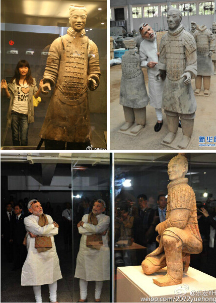 今日莫迪訪華,網(wǎng)絡(luò)兩張圖片來(lái)自現(xiàn)場(chǎng),抓拍得非常到位。聯(lián)想到當(dāng)年自己在西安拍攝的一張趣味照片,一名參觀的女孩子,文化衫上ILOVEBOYS的字樣,與圖中兵俑相映成趣。生活是有趣味的,不是冰冷的!