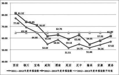 2012-2013年度,各市幸福指數(shù)排名依次為西安、銅川、寶雞、渭南、漢中、商洛、咸陽(yáng)、延安、安康、榆林。幸福指數(shù)排名與上年度相比基本保持穩(wěn)定,西安、銅川、寶雞、渭南、咸陽(yáng)五市排名未發(fā)生變化。漢中進(jìn)步一個(gè)位次,由第6位升至第5位;延安進(jìn)步兩個(gè)位次,由第10位上升至第8位;商洛、安康、榆林均倒退一個(gè)位次。各市幸福指數(shù)較上年度均有不同程度的增長(zhǎng),漢中、咸陽(yáng)、延安的幸福指數(shù)增長(zhǎng)幅度超過(guò)10%;寶雞、商洛的幸福指數(shù)增長(zhǎng)幅度超過(guò)8%;其余城市的增長(zhǎng)幅度均超過(guò)5%。全省居民幸福指數(shù)平均值為64.65,高于全省平均值的有西安、銅川、寶雞三市,其余城市均低于全省平均水平。