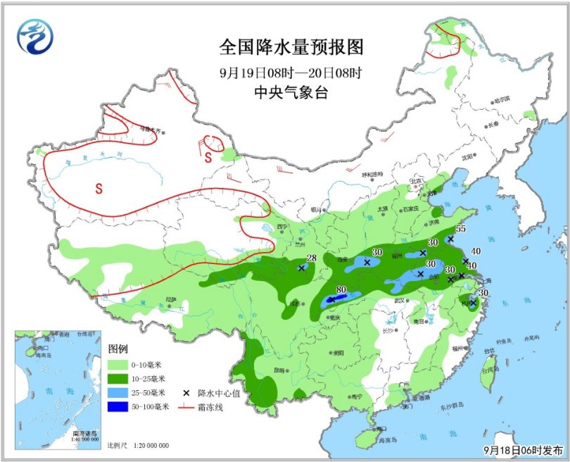 9月19日08時(shí)至20日08時(shí),黃淮、江淮、江漢北部、江南東北部、西北地區(qū)東南部和中南部、西南地區(qū)北部和東北部、云南西部和南部等地的部分地區(qū)有中到大雨,其中,山東東南部、四川東北部、重慶北部等地的部分地區(qū)有暴雨(50~80毫米),新疆北部和東部、內(nèi)蒙古北部等地有4~6級(jí)風(fēng),新疆南疆盆地和東部局地有揚(yáng)沙或沙塵。