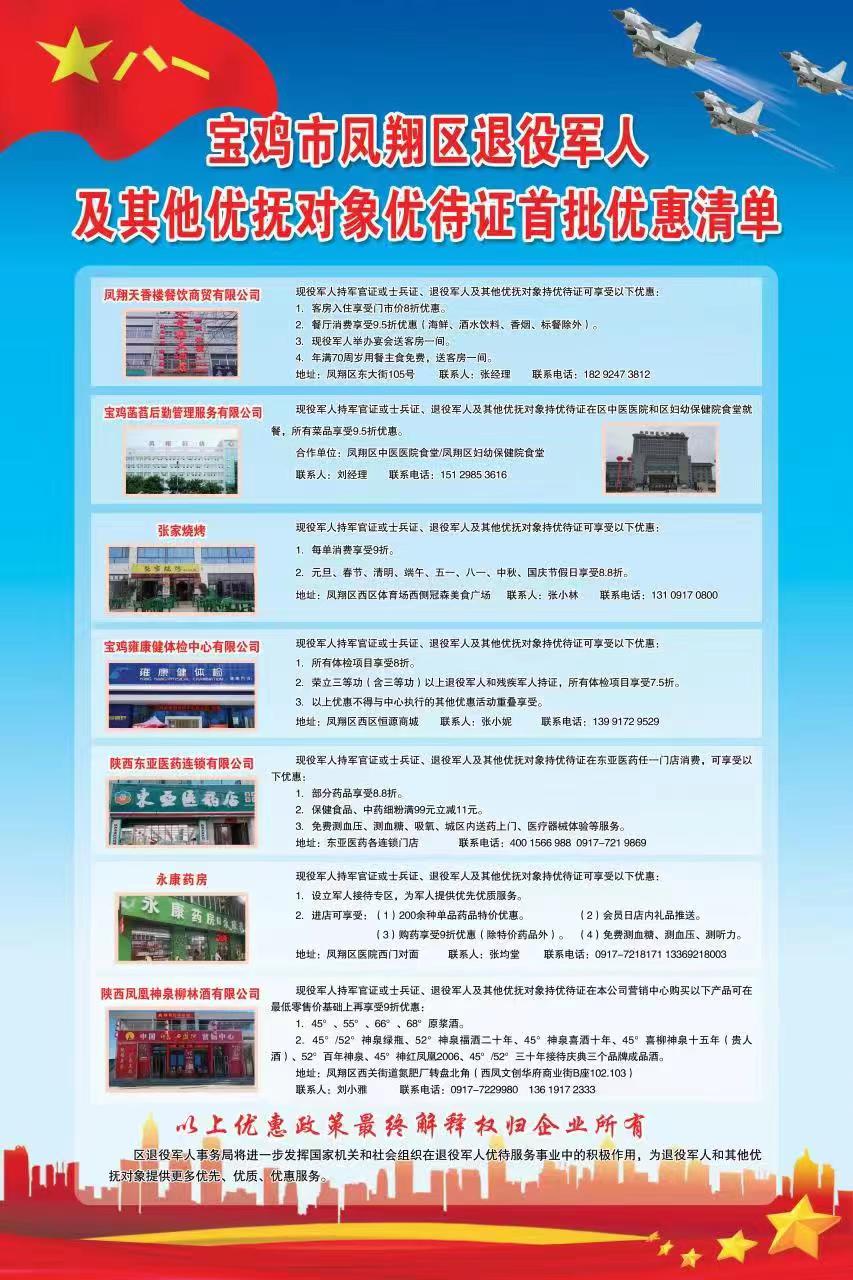 鳳翔區(qū)退役軍人事務(wù)局為進(jìn)一步提高退役軍人及其他優(yōu)撫對象的獲得感、幸福感和榮譽(yù)感,營造“讓軍人成為全社會尊崇的職業(yè)、讓退役軍人成為全社會尊重的人”的濃厚氛圍,聯(lián)合區(qū)內(nèi)18家企業(yè)推出鳳翔區(qū)退役軍人及其他優(yōu)撫對象優(yōu)待證首批優(yōu)惠,讓退役軍人享受到實實在在的優(yōu)惠政策,以實際行動詮釋了社會責(zé)任和企業(yè)精神,促進(jìn)了我區(qū)“雙擁”工作再上新臺階。