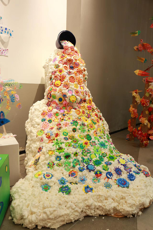三個主題展區(qū)除展出單體作品外,還專設了師生合作的主題表達的藝術(shù)裝置。這些靈動的裝置設計,通過高低錯落的物品布局、不同材質(zhì)、造型的器具選擇、物品色彩的過渡與明暗色調(diào)的處理,呈現(xiàn)了老師和孩子們對主題內(nèi)容深刻內(nèi)涵的理解表達與藝術(shù)構(gòu)思。