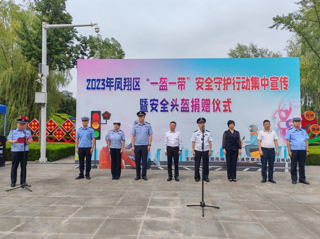 “一盔一帶,安全常在。一盔是指安全頭盔,當意外發(fā)生時,頭盔可以吸收大部分的沖擊能量。使頭部和面部受傷的風險降低70%……”9月1日下午2點30分,寶雞市鳳翔區(qū)2023年“‘一盔一帶’安全守護行動集中宣傳暨安全頭盔捐贈儀式”文明實踐活動在城墻遺址公園廣場舉辦,寶雞市交警支隊黨委委員、副支隊長韓宏偉,鳳翔區(qū)委常委、宣傳部部長賈亞斌,副區(qū)長王珍,寶雞市公安局鳳翔分局政委李炤出席活動。