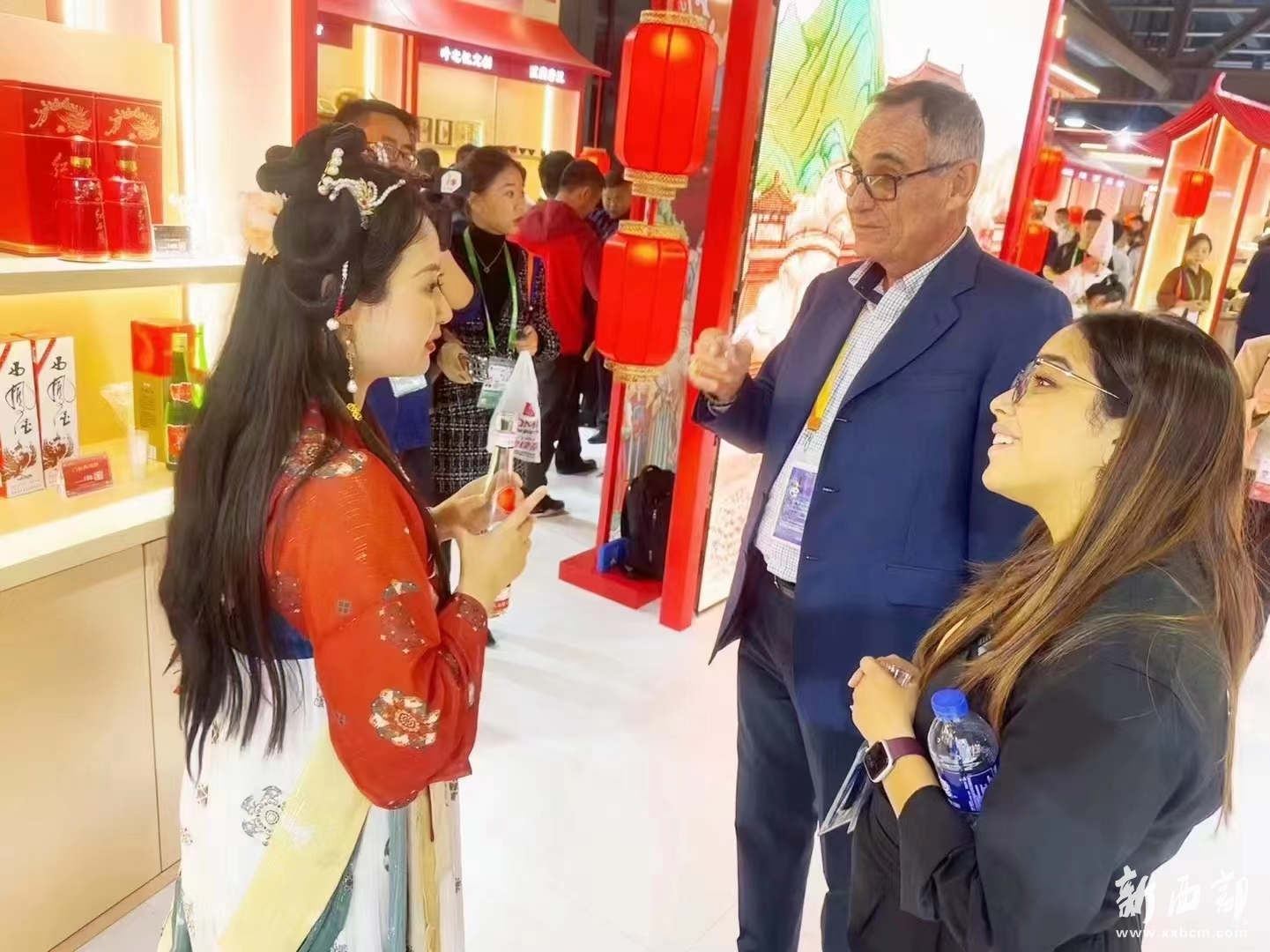 在國(guó)家會(huì)展中心和愛(ài)琴海購(gòu)物中心,充滿人間煙火味的西鳳酒、鳳翔泥塑、豆花泡饃、西府搟面皮等鳳翔名優(yōu)特產(chǎn)品深受青睞和熱捧。國(guó)內(nèi)外客商和觀眾絡(luò)繹不絕,紛紛駐足圍觀,品鑒品嘗,交流攀談,合影留念。陜西西鳳酒股份有限公司、陜西古關(guān)中酒業(yè)有限公司、陜西長(zhǎng)虹亞利餐飲有限公司、鳳翔秦兜福餐飲有限公司、鳳翔新明民俗文化傳承有限公司展覽各類鳳翔名優(yōu)特產(chǎn)30多種,現(xiàn)場(chǎng)銷售680余件。