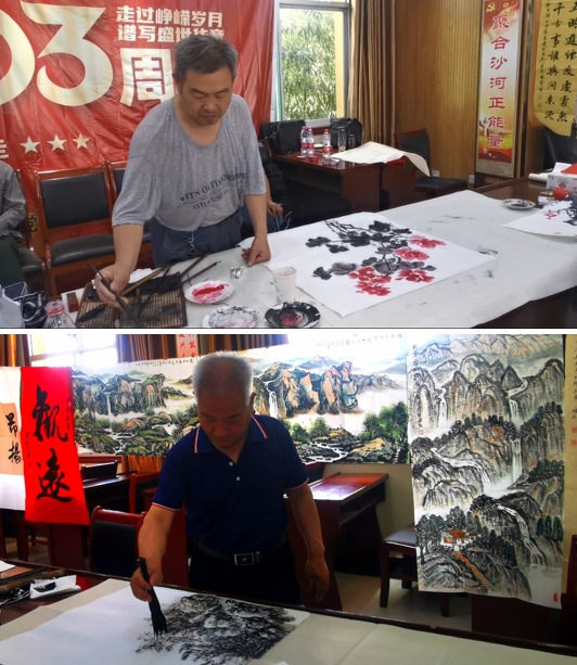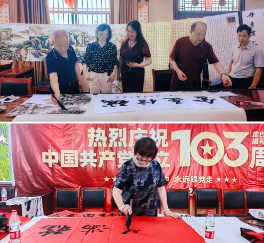 活動(dòng)開(kāi)始,街道辦曹主任講到:103年的春風(fēng)化雨,我們一路堅(jiān)定初心,103年的春華秋實(shí),我們一路守護(hù)初心,103年的千秋偉業(yè),我們一路永葆初心,在這個(gè)普天同慶的日子,我們祝黨103歲生日快樂(lè),黨是我們的驕傲,我們永遠(yuǎn)熱愛(ài)黨。一大早,藝術(shù)家們就開(kāi)始揮毫潑墨,以飽滿的熱情和精湛的技藝,創(chuàng)作出了一幅幅寓意深刻、內(nèi)涵豐富的書(shū)畫(huà)作品。這些作品不僅展現(xiàn)了書(shū)畫(huà)家們對(duì)黨的深厚感情和對(duì)祖國(guó)的無(wú)限熱愛(ài),更體現(xiàn)了中國(guó)人民在新時(shí)代新征程上繼續(xù)奮斗、勇攀高峰的堅(jiān)定信念。