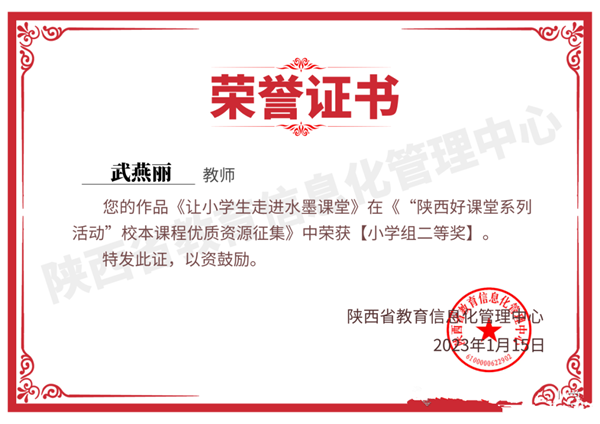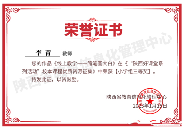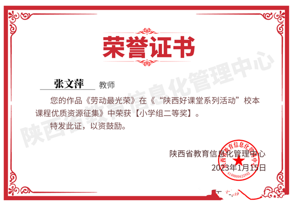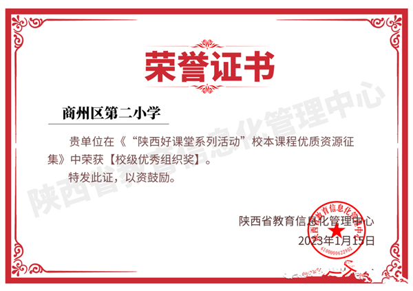 揮灑辛勤汗水,收獲成功喜悅。熱烈祝賀在2022“陜西好課堂”—校本課程優(yōu)質(zhì)資源征集評(píng)選活動(dòng)中,商州區(qū)第二小學(xué)榮獲優(yōu)秀組織獎(jiǎng)。商州區(qū)第二小學(xué)韓寶珍、張亮、張文萍、武燕麗、齊秀麗、李青、金防陣、薛濤、王波九位老師的作品獲獎(jiǎng)。