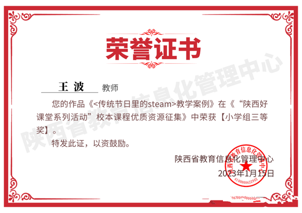 在“雙減”與教育優(yōu)質(zhì)均衡的背景下,學(xué)校對(duì)校本課程不斷深化研究,搭建教師成長(zhǎng)的平臺(tái),著力提升教育教學(xué)質(zhì)量。根據(jù)《關(guān)于開(kāi)展“陜西好課堂”網(wǎng)絡(luò)大賽及“雙減”工作優(yōu)秀案例征集展示交流培訓(xùn)系列活動(dòng)的通知》(陜信教〔2022〕8號(hào))的文件精神,商州區(qū)第二小學(xué)認(rèn)真籌備,精心組織,鼓勵(lì)教師積極參與。最終,韓寶珍、張亮、張文萍、武燕麗、金防陣、李青、齊秀麗、薛濤、王波九位老師的作品在全省2329件作品中脫穎而出,在陜西省校本課程優(yōu)質(zhì)資源征集評(píng)比活動(dòng)中獲獎(jiǎng)!