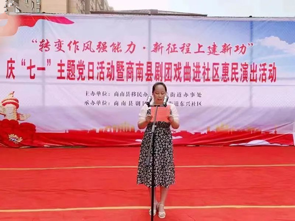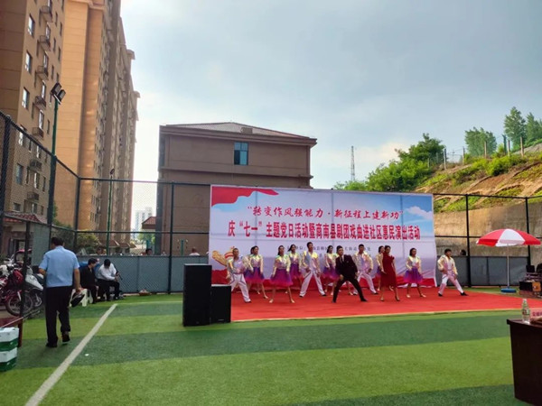 為深入貫徹落實(shí)習(xí)近平新時(shí)代中國特色社會(huì)主義思想和黨的二十大精神,慶祝中國共產(chǎn)黨成立102周年,回顧黨的百年光輝歷程,頌揚(yáng)黨的豐功偉績,豐富轄區(qū)居民精神文化生活,6月25日下午,商南縣城關(guān)街道東興社區(qū)聯(lián)合商南縣移民辦、商南縣劇團(tuán)、城關(guān)街道辦事處、城關(guān)街道派出所舉辦“轉(zhuǎn)變作風(fēng)強(qiáng)能力 新征程上建新功”慶“七一”主題黨日活動(dòng)。