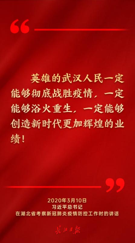 武漢必勝,湖北必勝,中國必勝。武漢人民正與全國人民一起,奮力續(xù)寫新時代更多“偉大奇跡”,向著中華民族偉大復(fù)興的光輝彼岸奮勇前進。