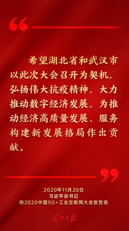 2020年11月,總書記向中國5G+工業(yè)互聯(lián)網(wǎng)大會發(fā)來賀信,信中說:“大會在湖北武漢召開有著特殊意義。希望湖北省和武漢市以此次大會召開為契機,弘揚偉大抗疫精神,大力推動數(shù)字經(jīng)濟發(fā)展,為推動經(jīng)濟高質(zhì)量發(fā)展、服務(wù)構(gòu)建新發(fā)展格局作出貢獻?!?/p>