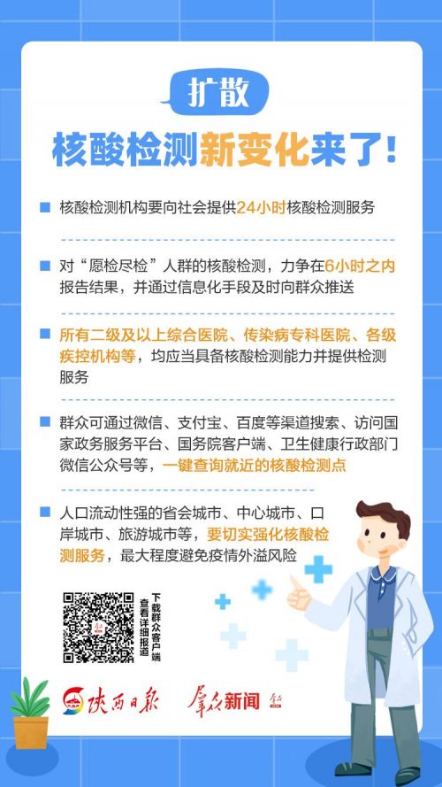 國務(wù)院聯(lián)防聯(lián)控機制近日印發(fā)《關(guān)于進一步強化當(dāng)前新冠病毒核酸檢測服務(wù)的通知》,要求對“愿檢盡檢”人群的核酸檢測,力爭在6小時之內(nèi)報告結(jié)果,并通過信息化手段及時向群眾推送。
