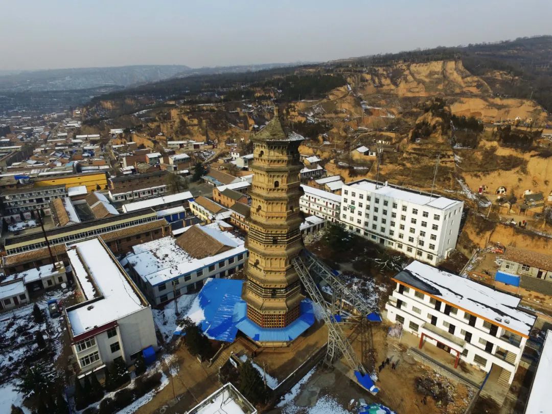 該工程在磚塔突發(fā)傾斜瀕臨倒塌情況下,為了抵消傾斜與糾偏中可能會(huì)產(chǎn)生的塔中軸面剪拉應(yīng)力及塔下部產(chǎn)生的局部不均衡過大壓應(yīng)力,對(duì)塔體采取了可逆的箍緊預(yù)加固措施,有效解除了該塔倒塌的安全隱患。該工程的糾偏技術(shù)方法對(duì)黃土地區(qū)的同類古塔糾偏探索出了一條非常有效可行和經(jīng)濟(jì)的技術(shù)手段,具有一定的推廣意義。該工程2014 年8月17日開工,2017 年9月10日竣工。2019 年11月22日通過竣工驗(yàn)收。