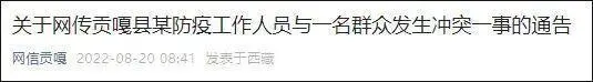 據(jù)“網(wǎng)信貢嘎”微信公號8月20日消息,西藏貢嘎縣應(yīng)對新冠肺炎疫情工作領(lǐng)導(dǎo)小組辦公室當(dāng)日發(fā)布《關(guān)于網(wǎng)傳貢嘎縣某防疫工作人員與一名群眾發(fā)生沖突一事的通告》。