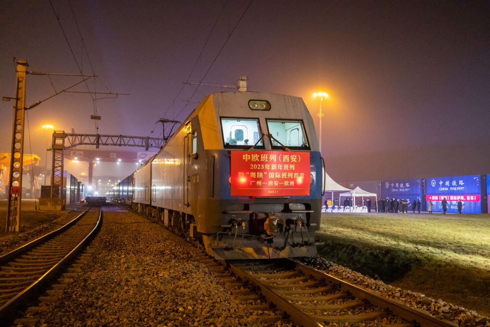 2023年首列“粵陜”國際班列(廣州-西安-歐洲)在元旦零時迎新啟航。 劉翔 攝