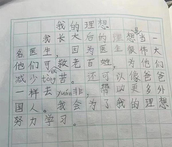郭建偉的兒子剛剛9歲,用漢字和拼音組合寫了一篇題為《我的理想》的作文。孩子在文中說,希望長大后當(dāng)一名醫(yī)生,像爸爸一樣援非,幫助更多的人。
