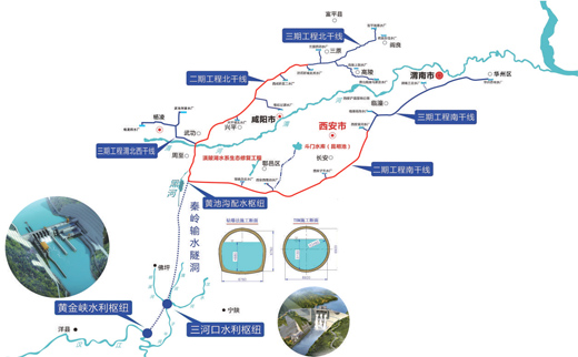 引漢濟渭工程分為調(diào)水工程(一期工程)和輸配水工程(二期工程和三期工程),目前一期工程已基本完工,二期工程部分完工。調(diào)水工程由黃金峽水利樞紐、三河口水利樞紐和秦嶺輸水隧洞三部分組成。其中,秦嶺輸水隧洞是引漢濟渭工程的“大動脈”,這是人類第一次從底部鑿穿秦嶺。