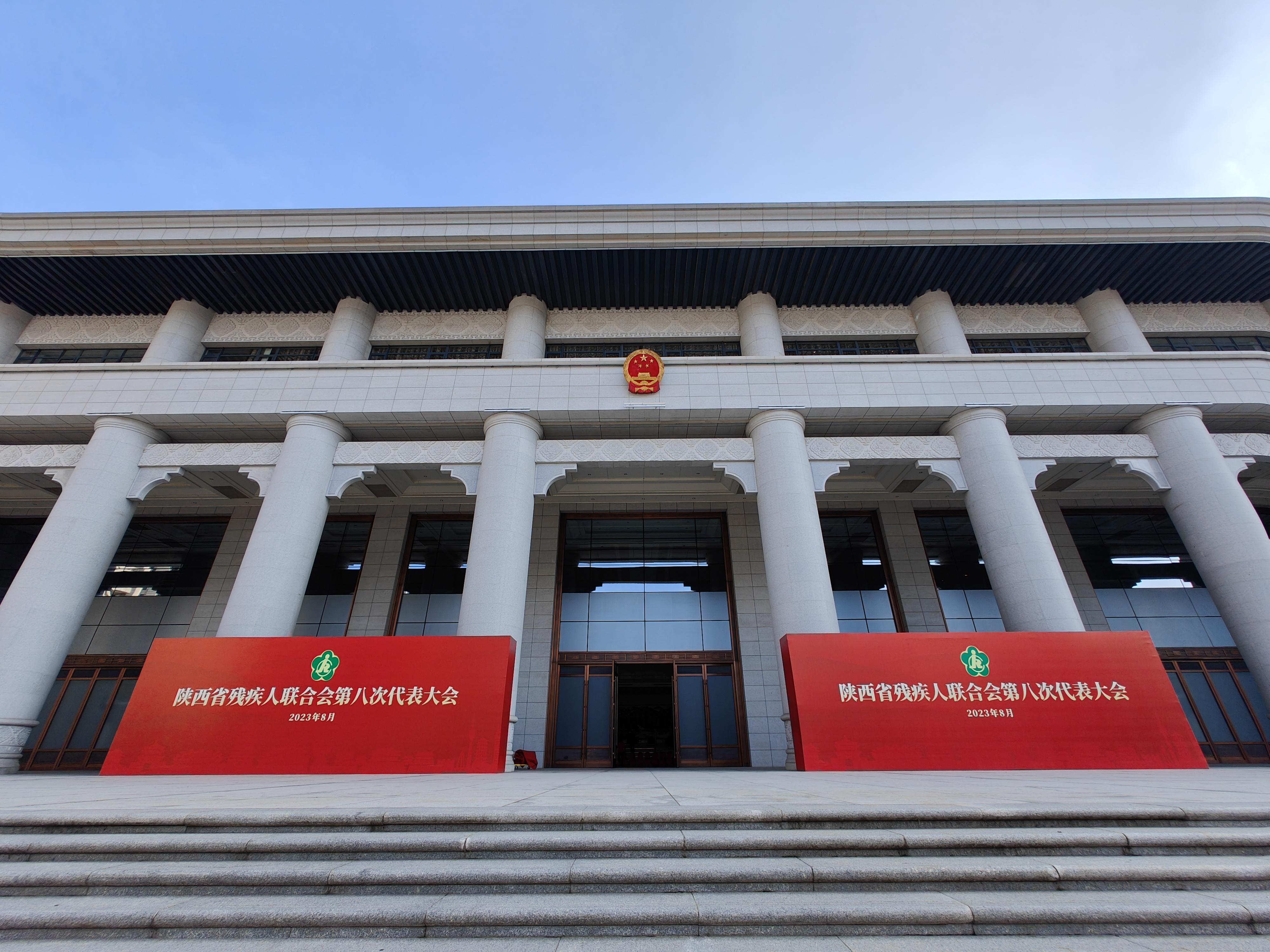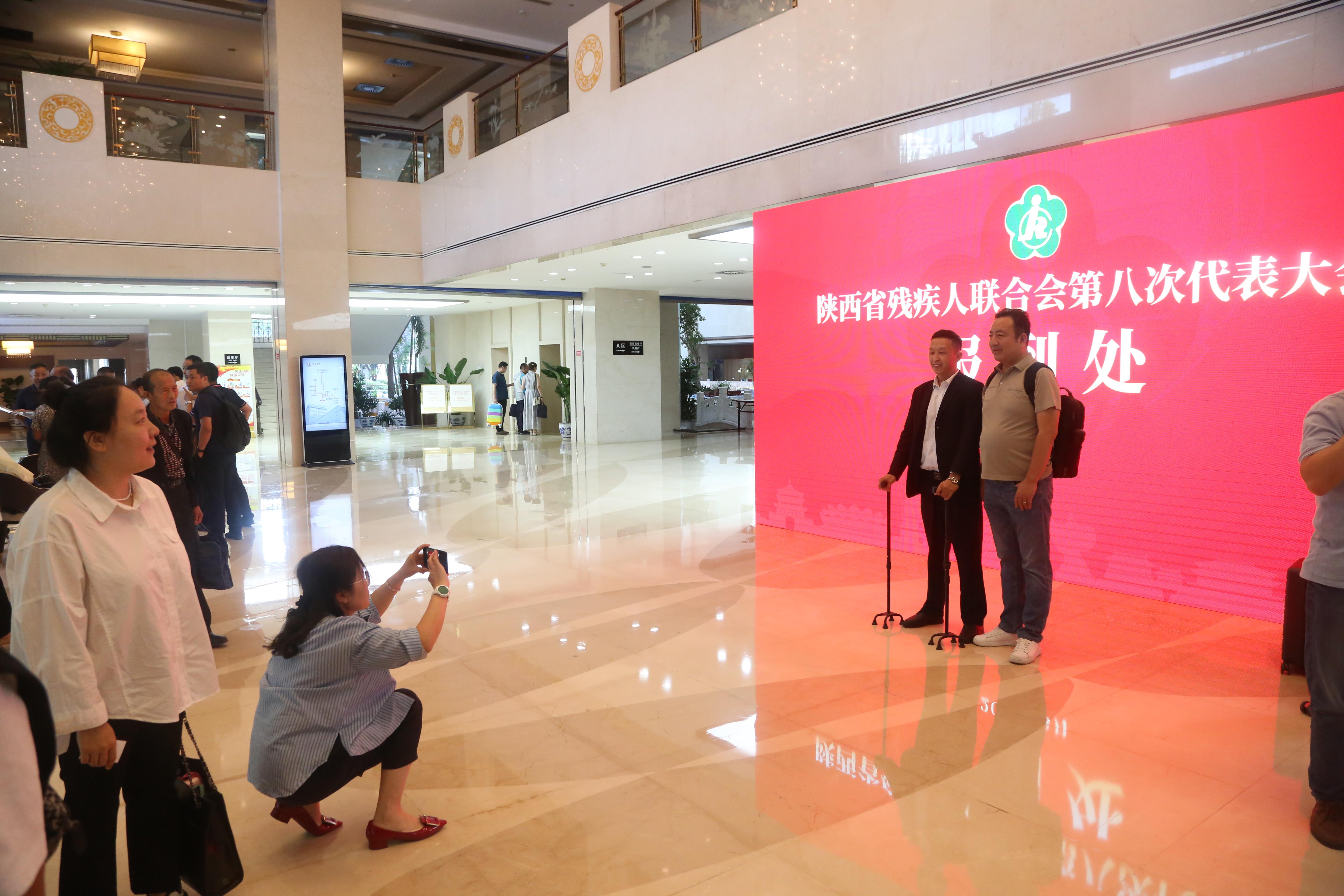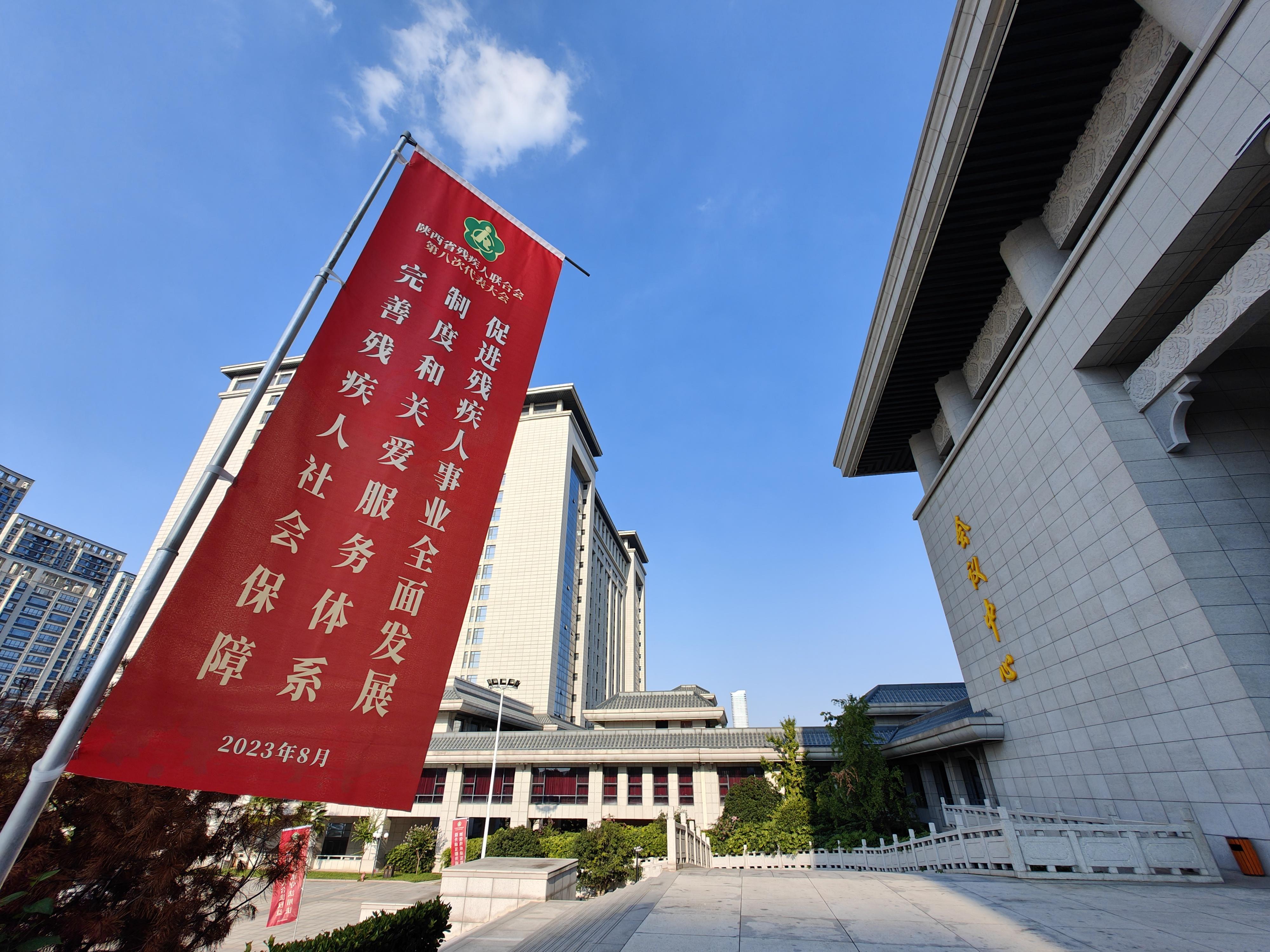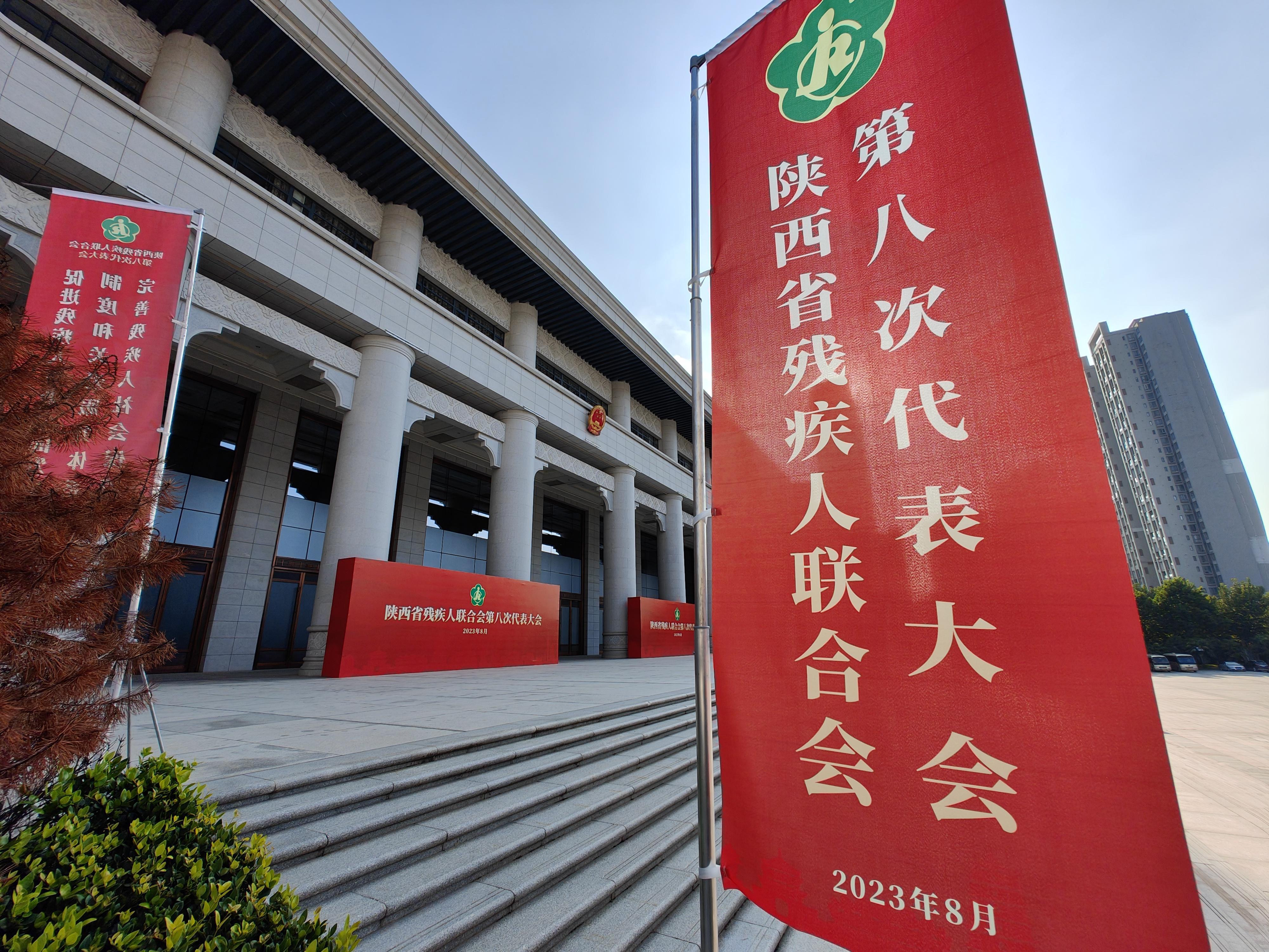 陜西賓館道路兩旁,“陜西省殘疾人聯(lián)合會第八次代表大會”字樣的旗幟、展板、指示牌,分外引人注目。