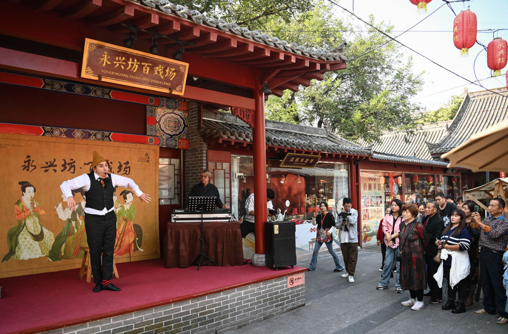 ▲9月12日,西安市新城區(qū)“遇見城墻·非遺韻”非遺集市上,表演者在進(jìn)行秦腔演出。新華社記者 劉瀟 攝