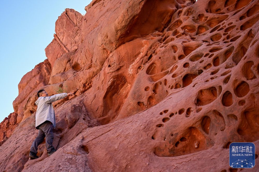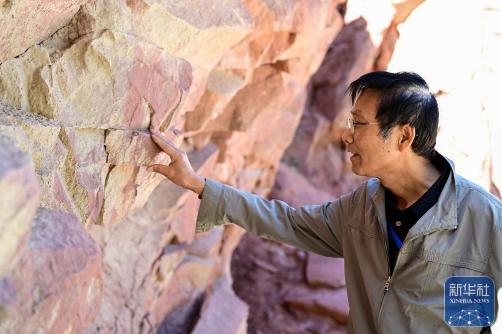 在新疆克孜勒蘇柯爾克孜自治州阿克陶縣布倫口鄉(xiāng)一處峽谷,考古專家覃大海在查看巖層(10月19日攝)。