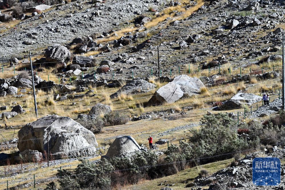 在新疆克孜勒蘇柯爾克孜自治州阿克陶縣布倫口鄉(xiāng)一處峽谷,中國(guó)社會(huì)科學(xué)院地質(zhì)與地球物理研究所副研究員唐自華在查看巖體(10月19日攝)。