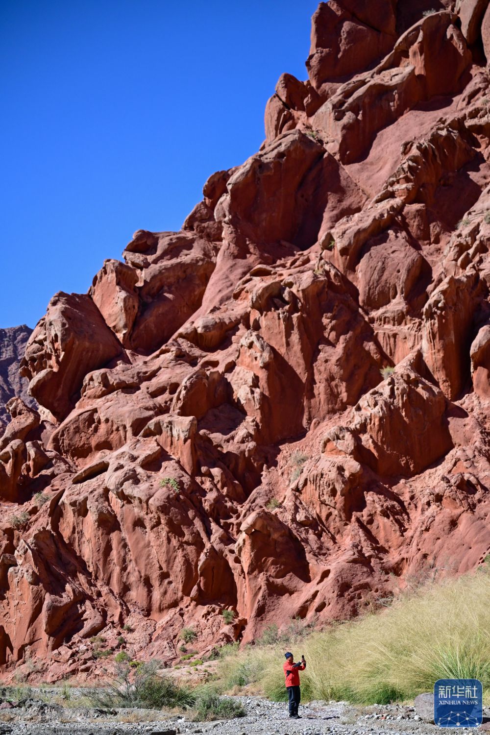在新疆克孜勒蘇柯爾克孜自治州阿克陶縣布倫口鄉(xiāng)一處峽谷,中國(guó)社會(huì)科學(xué)院考古研究所研究員巫新華用手機(jī)拍攝巖體(10月19日攝)。