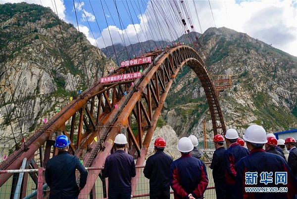 9月28日拍攝的川藏鐵路拉林段重點標(biāo)志性工程藏木特大橋合龍儀式現(xiàn)場。新華社記者普布扎西攝