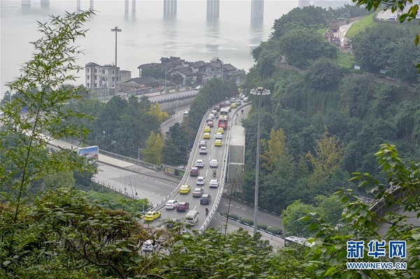 緊靠長江邊,在一片綠色包圍下的重慶城市公路(2018年12月2日攝)。 新華社記者 劉潺 攝