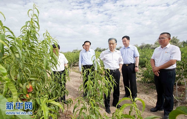 7月21日至24日,中共中央政治局常委、全國政協(xié)主席汪洋在新疆調研兵團工作。這是23日,汪洋在兵團十師北屯市千畝桃園了解果樹長勢。新華社記者 李濤 攝