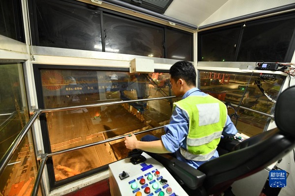 在廣西北海鐵山港,門機司機黃冠在進行夜間作業(yè)(9月21日攝)。新華社記者黃孝邦攝