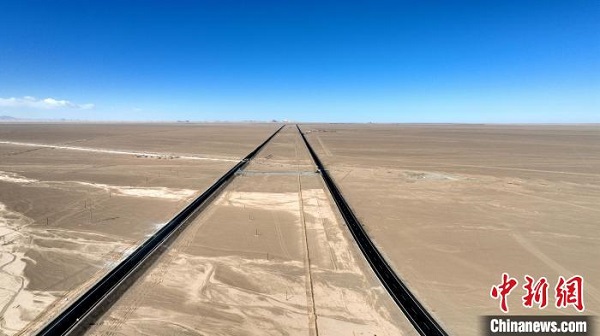 圖為航拍青海格爾木至老茫崖公路擴(kuò)建項(xiàng)目。青海省交控集團(tuán)供圖