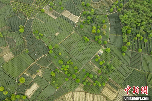 4月上旬,四川省雅安市名山縣,俯瞰連片的茶葉種植基地。(無人機(jī)照片)中新社記者張浪攝