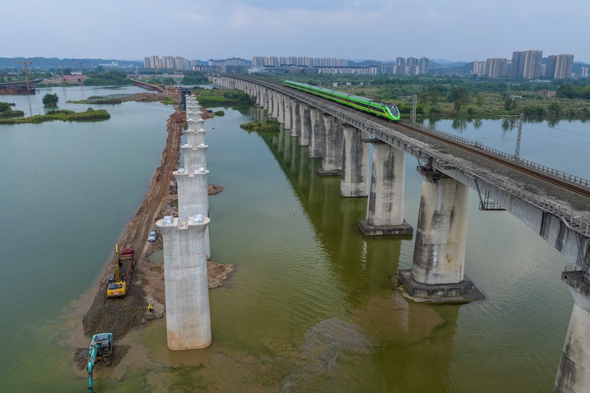 成達(dá)萬高鐵遂寧涪江特大橋部分橋墩已完工,旁邊一列動(dòng)車組快速駛過。成蘭公司供圖