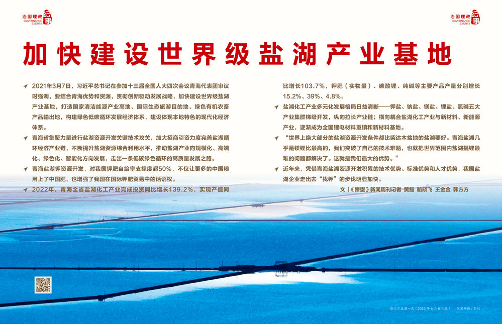配合這一方案,青海2022年底印發(fā)《青海省加快推進(jìn)世界級鹽湖產(chǎn)業(yè)基地建設(shè)促進(jìn)鹽湖產(chǎn)業(yè)高質(zhì)量發(fā)展若干措施》,提出27條具體措施,進(jìn)一步優(yōu)化一體化共建世界級鹽湖產(chǎn)業(yè)基地體制機制,構(gòu)建現(xiàn)代產(chǎn)業(yè)體系,促進(jìn)鹽湖產(chǎn)業(yè)發(fā)展創(chuàng)新鏈、產(chǎn)業(yè)鏈和供應(yīng)鏈協(xié)同體系深度融合。