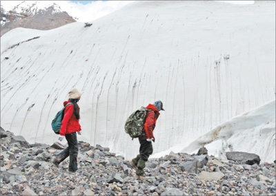近日,徐柏青(右)帶著學生走在唐古拉山龍匣宰隴巴冰川旁的碎石灘上。索朗羅布攝(新華社發(fā))