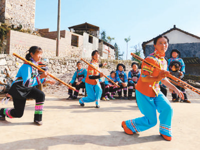 從羅平縣城出發(fā),山道彎彎,一路攀行,大補(bǔ)董村就隱藏在滇、黔、桂三省交界的群山深處。公路逼仄,牛群歸圈,頭牛似乎少有與汽車(chē)遭遇的經(jīng)驗(yàn),掉頭便跑,驚得鴉雀?jìng)儭皳淅饫狻彼南聛y飛。翻過(guò)一個(gè)埡口后,一座形似牛頭綴飾的彝家寨門(mén)出現(xiàn)了。