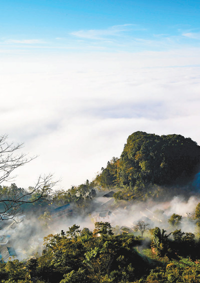 繼續(xù)前行,眼前是一座孤峰。登頂氣喘未定,舉目四望,落日熔金,遠(yuǎn)處一簇簇山峰涌起,不似一片片森林,卻如一望無(wú)盡的山峰匯成的大海。回望大補(bǔ)董村,恰在一絲白云下面,“山頂上的美麗人家”,一行人不禁感嘆彝語(yǔ)描述的精妙。