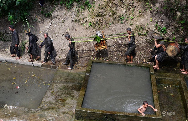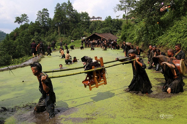 2016年8月14日,貴州省劍河縣革東鎮(zhèn)交榜村,人們?cè)凇疤Ч饭?jié)”活動(dòng)中抬狗游行?!疤Ч饭?jié)”民俗活動(dòng),吸引著四鄉(xiāng)八里的少數(shù)民族群眾前往感受這一神秘的民族節(jié)日。楊文斌 方鵬/東方IC