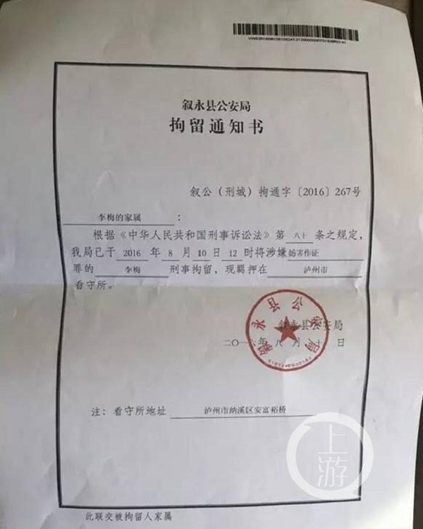 瀘州市敘永縣公安局正式對李梅以涉嫌妨害作證罪刑事拘留。